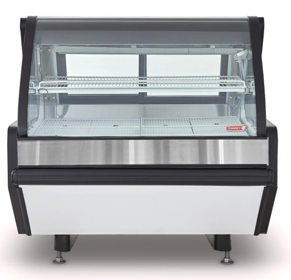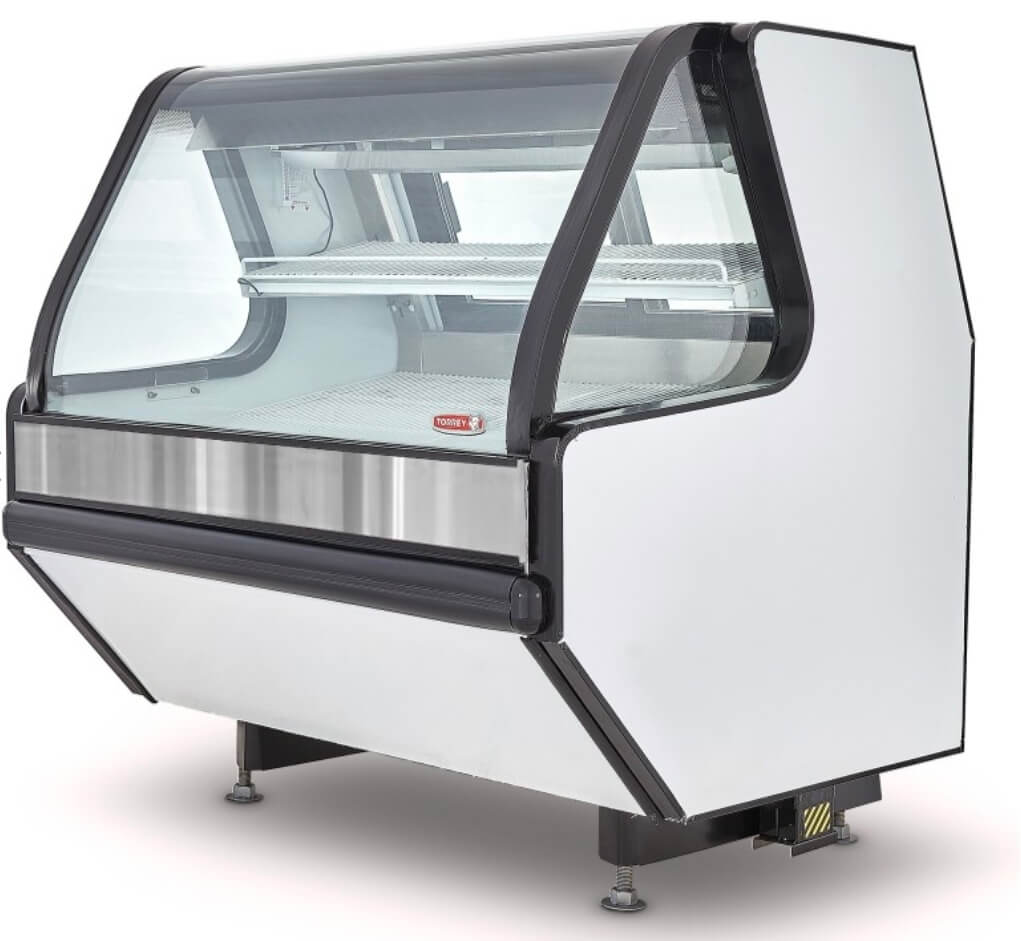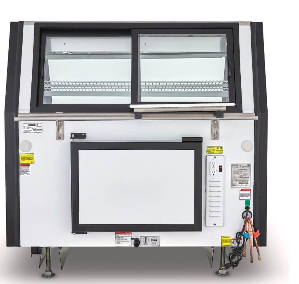 Vitrina carnicera modular de 1.3 m de largo color blanco, con puertas posteriores de vidrio, almacén inferior para congelamiento, ideal para grandes cadenas de autoservicios y carnicerías grandes.