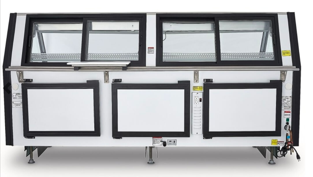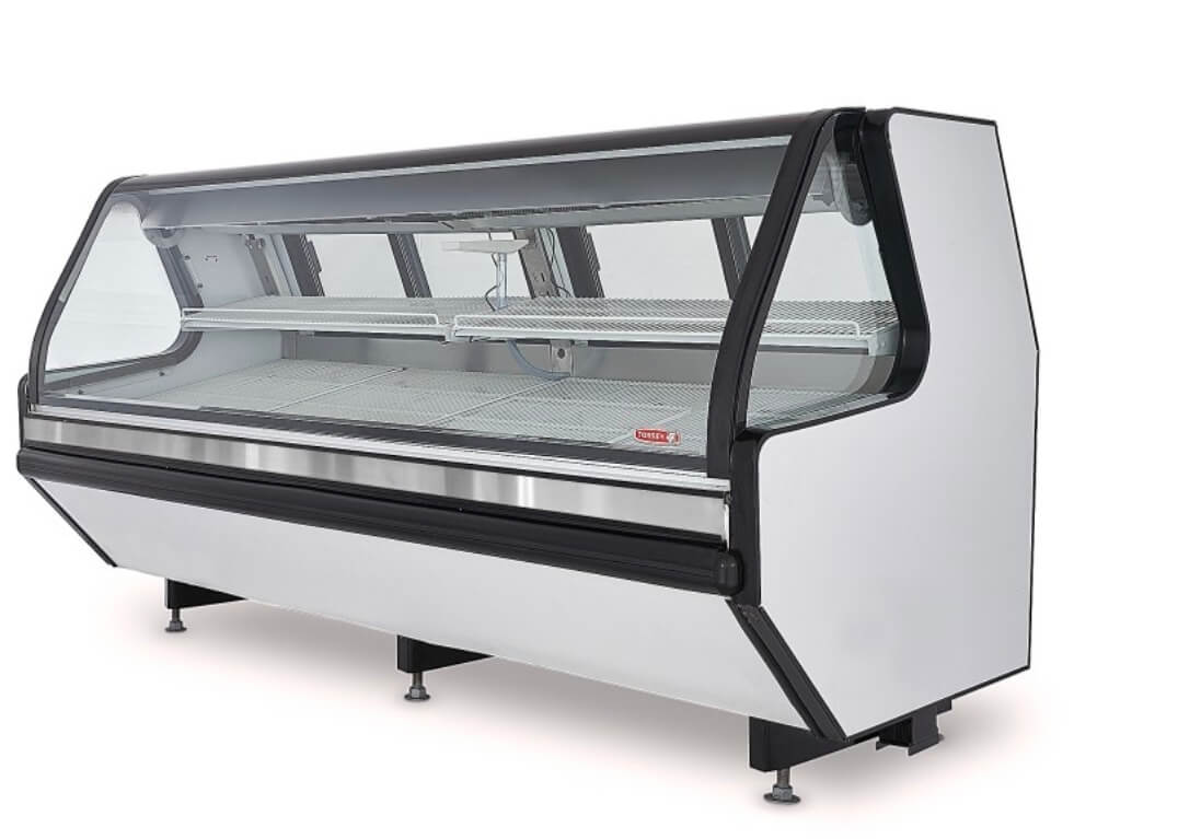 Vitrina carnicera modular de 2.5 m de largo color blanco, con vidrio frontal abatible que facilita el llenado de producto y limpieza, con ventanas laterales y puertas posteriores de vidrio para exhibición panorámica, y almacén inferior para congelamiento, ideal para grandes cadenas de autoservicios y carnicerías grandes.