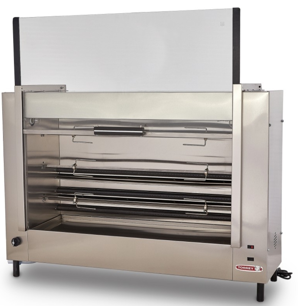 Rosticero de gas fabricado en acero inoxidable con capacidad para 27 pollos, espacio para exhibición caliente.