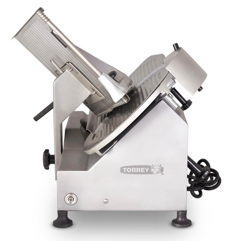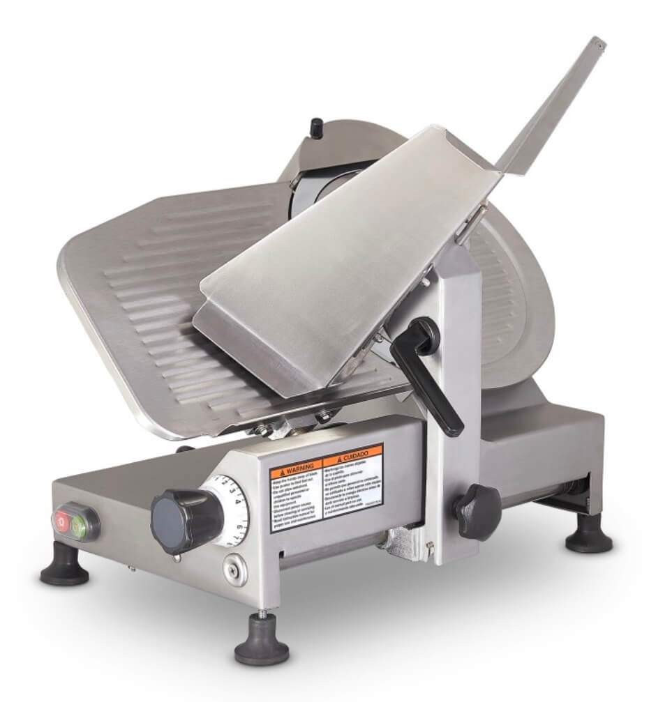 Rebanadora de carnes frías para delicatessen de acero inoxidable con cuchilla de 300 mm, afilador integrado, protector de navaja y transmisión de banda
